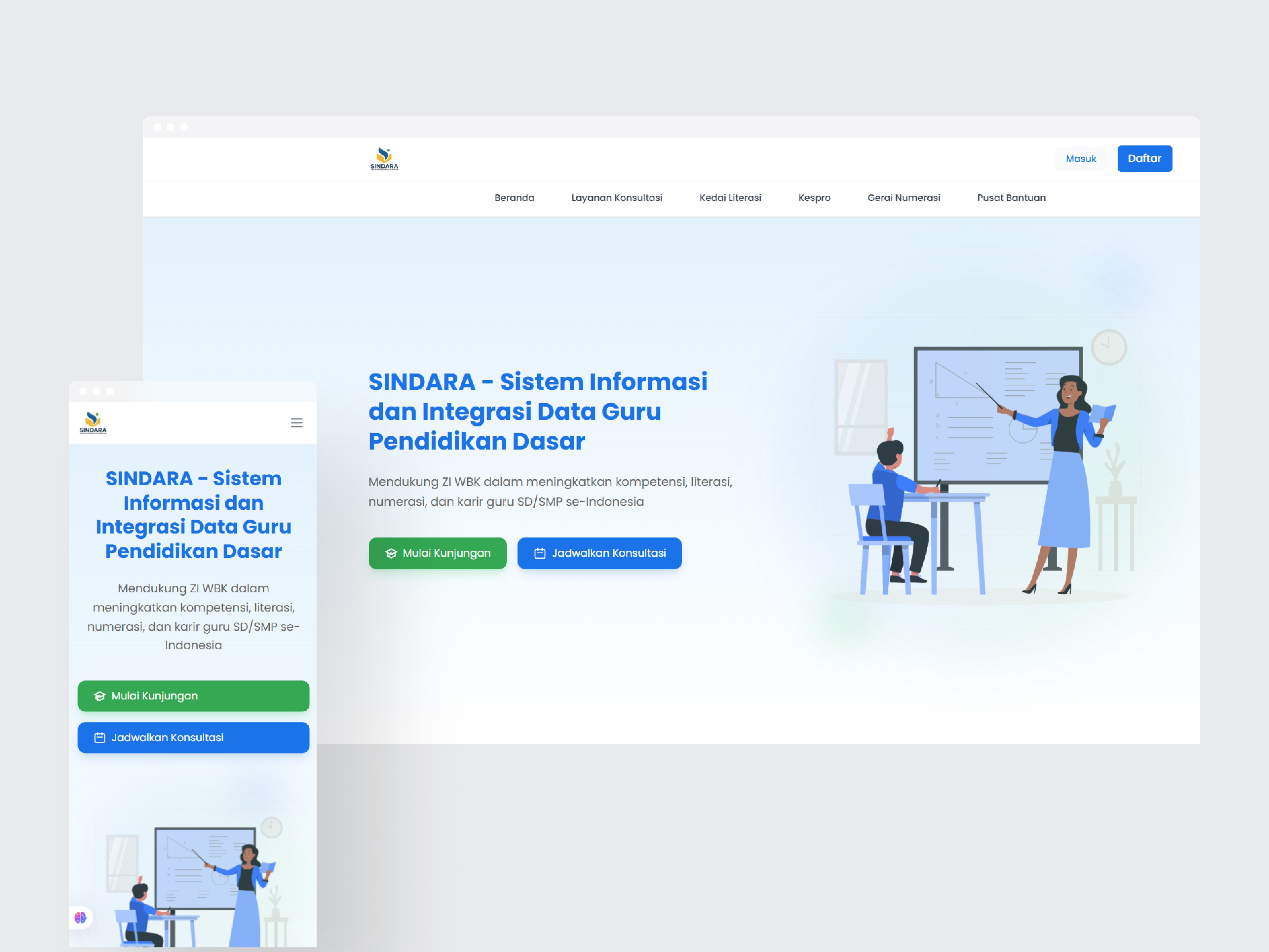 Sindara is a national education portal used by teachers across Indonesia. I designed the UI with Figma and built the responsive frontend using Next.js, Tailwind CSS, and ShadCN. The project includes API integration with Laravel using Axios and React Query, and form validation using Zod.
